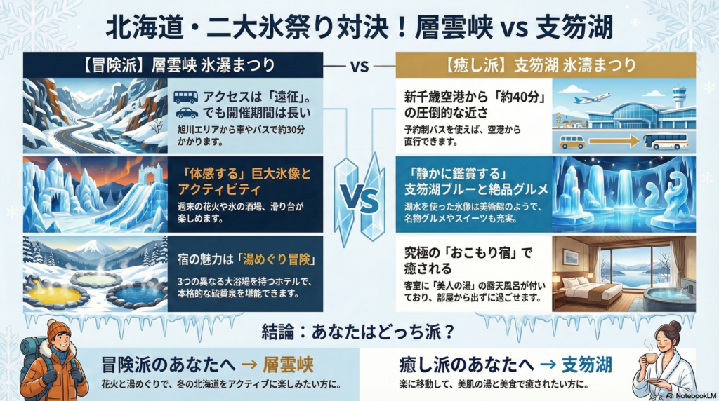| アクセス | 遠い 旭川紋別道「上川層雲峡IC」から車で30分。 JRなら「上川駅」からバスで30分。 | 近い 新千歳空港からタクシーで約40分(約7,000円)。 お祭り期間中は完全予約制バス「氷濤BLUE LINER」あり(片道1,000円〜)。 |