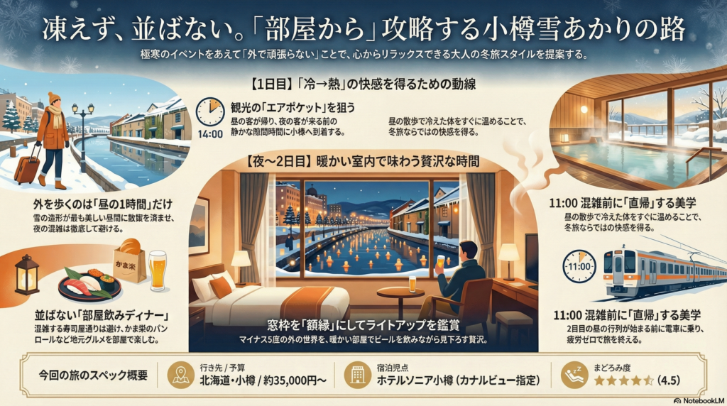 北海道・小樽の冬の風物詩**「小樽雪あかりの路」**を、並ばず、凍えず、ただ“まどろむ”ための行程を組みました。