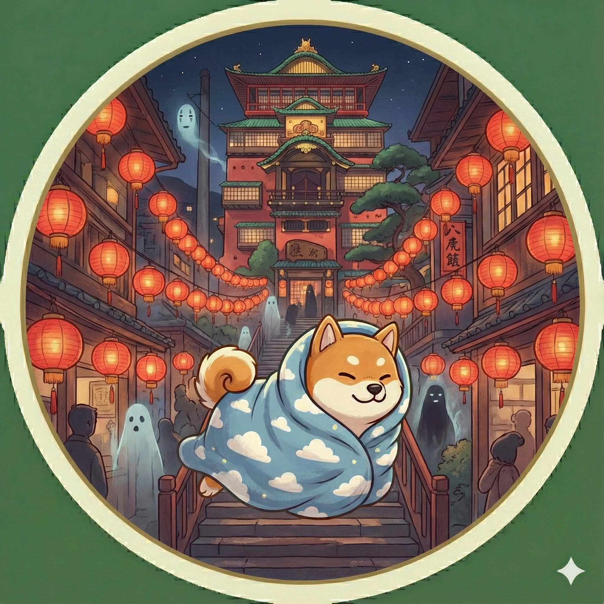 ほら、提灯にポッと明かりが灯って、湯屋(ゆや)に向かう神様たち(の妄想)がすれ違っていく…そんな幻想的な夜の風景が浮かんできませんか? まさに「神隠し」に遭いそうな瞬間です。