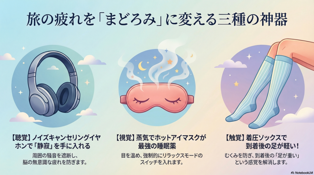 私は『まどろみ旅』を実践する中で気づきました。 疲れの原因の9割は、「騒音」「光」「むくみ」です。 この3つさえ遮断できれば、狭い機内や長距離バスでも、そこは快適なカプセルホテルに変わります。