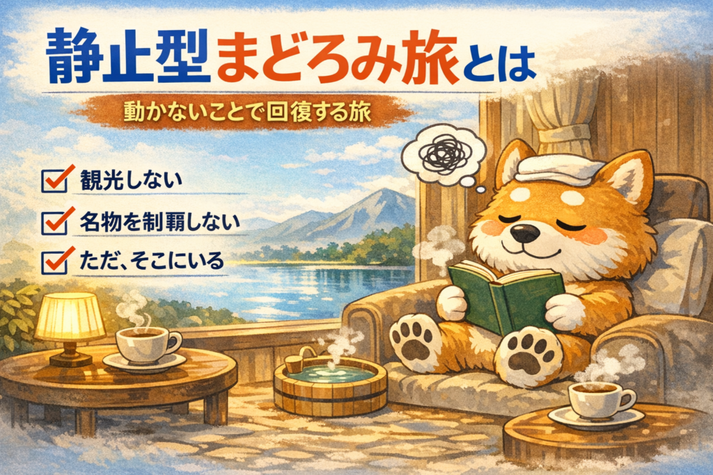 ―― 部屋完結温泉旅という選択 静止型まどろみ旅は、「観光を減らす旅」ではありません。 最初から、動かない前提で設計する旅です。 今回はその具体例として、部屋完結型の温泉旅を取り上げます。 設計の前提 まず、最初に決めることはこれです。 ・観光地... -