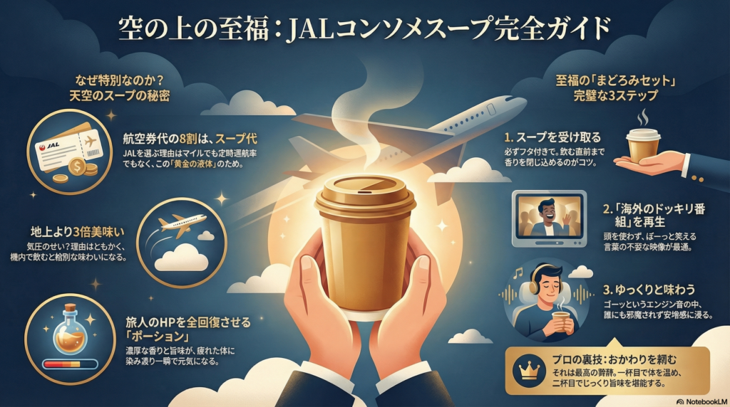 その一言で、あなたの移動時間は「我慢の時間」から「至福のまどろみタイム」に変わります。 私たちが払っている航空券代の8割は、たぶんこのスープ代なのですから。