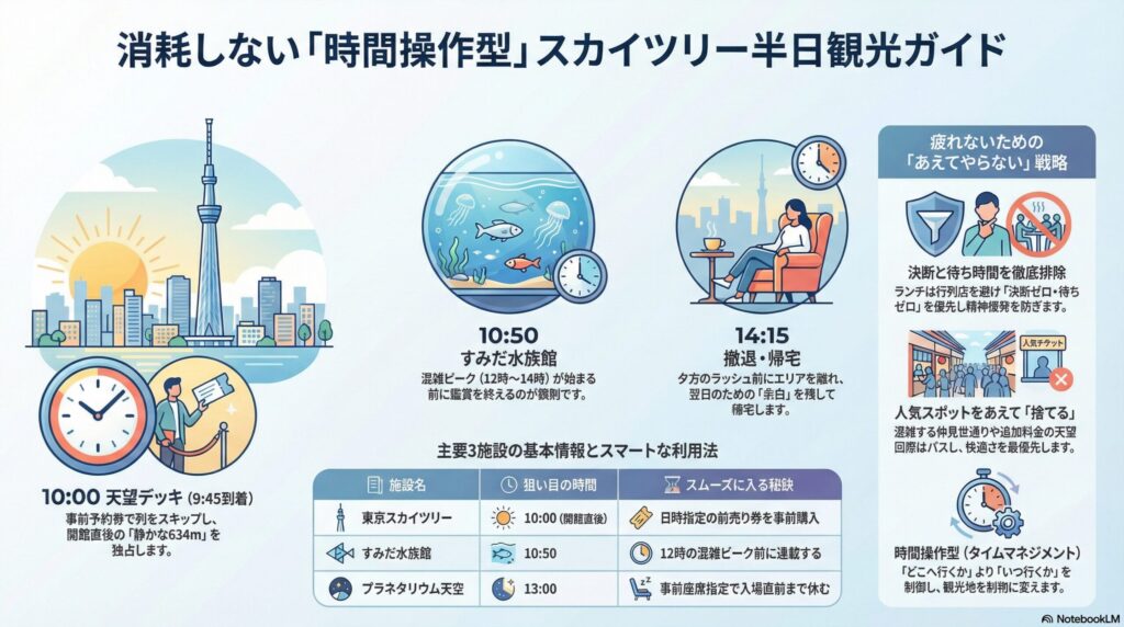 理由:平日10:00〜14:00はスカイツリー周辺の混雑が最も少ない時間帯。土日昼間は展望台・水族館ともに30〜60分待ちが発生するため。